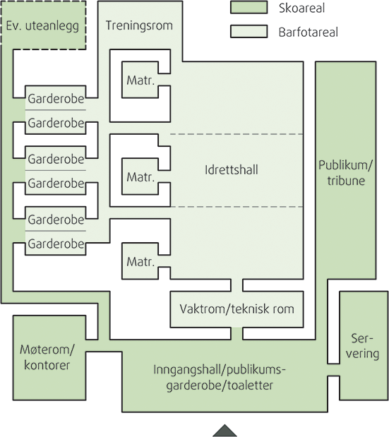 Forenklet funksjonsskjema som også viser skoareal/barfotareal. Hvis hallen kan deles med mobile skillevegger/nettvegger, må hver del ha direkte tilgang til materiellrom, og det bør være to garderobeenheter til hver hallenhet. [721]