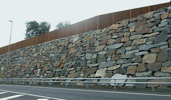 Veiskjæring hvor en forholdsvis stor høydeforskjell mellom vei og tilstøtende terreng tas opp ved en støttemur i naturstein kombinert med bevokst skråning og støyskjerm på toppen. Foto: SINTEF Byggforsk