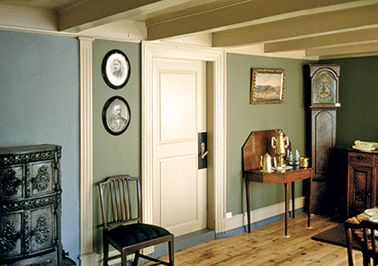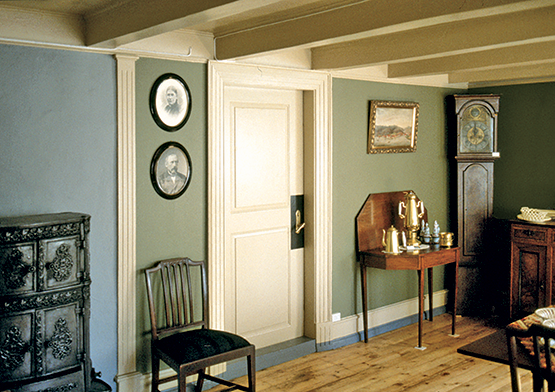 Sørlandsinteriør fra omkring år 1800 med gerikter i louis-seize-stil. Foto: Jon Brænne, Riksantikvarens arkiv
