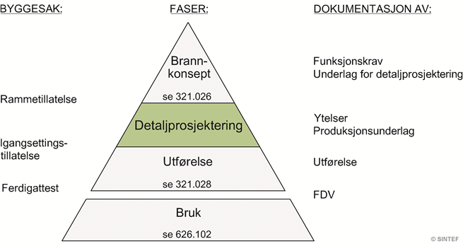 Figuren gir en oversikt over faser i byggeprosjektet som krever dokumentasjon av brannsikkerhet, og henviser til anvisninger der fasene omtales nærmere. Se også Planlegging 321.025.