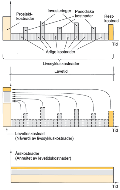 Sammenhengen mellom kostnadsbegreper som inngår i livssykluskostnader for et bygg