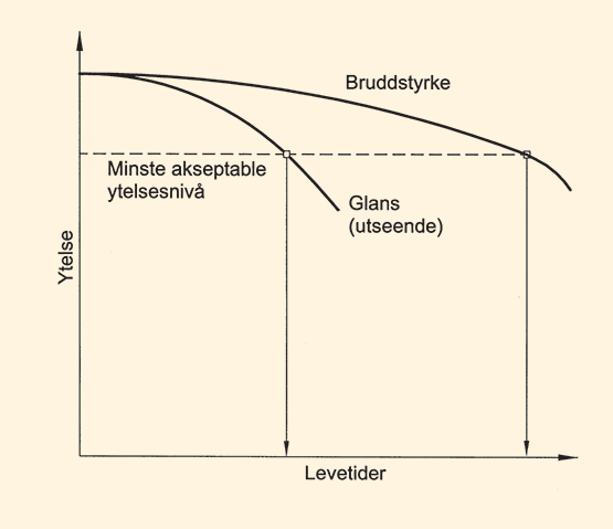 Levetid knyttes til nedbrytning/reduksjon av ytelse over tid, her vist for henholdsvis bruddstyrke og glans (utseende)