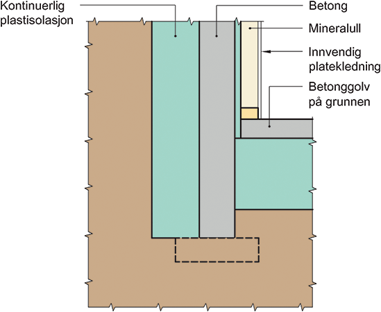 Prinsipiell oppbygning av tilslutning mellom betongvegg mot terreng og betonggolv på grunnen