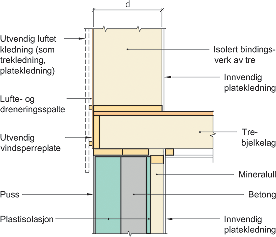 Prinsipiell oppbygning av tilslutning mellom betongvegg, isolert bindingsverksvegg av tre og isolert trebjelkelag