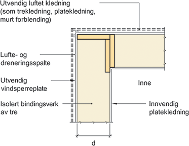 Prinsipiell oppbygning av utovervendt hjørne mellom bindingsverksvegger av tre
