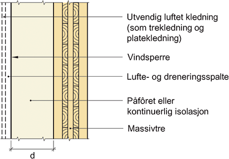 Prinsipiell oppbygning av vegg av massivtre med påfôret eller kontinuerlig isolasjon
