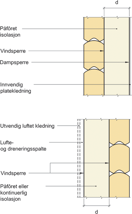 Prinsipiell oppbygning av laftet trevegg med innvendig påfôret isolasjon eller utvendig kontinuerlig isolasjon