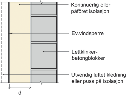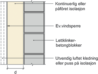 Denne anvisningen inneholder U-verdier for vegger over terreng, murt av lettklinkerbetongblokker, se fig. 01. Om vegger murt av lettklinkerbetongblokker med isolasjon, se Byggdetaljer 471.463 U-verdier. Vegger over terreng, murt av lettklinkerblokker med isolasjon.