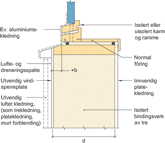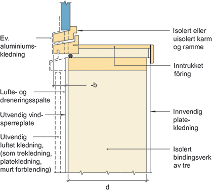 Prinsipiell oppbygning av tilslutning mellom vindu og bindingsverksvegg av tre. Vinduet er plassert innenfor vindsperra.