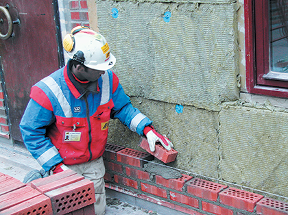 Oppmuring av ytre vange i en skallmurvegg. Foto: SINTEF Byggforsk