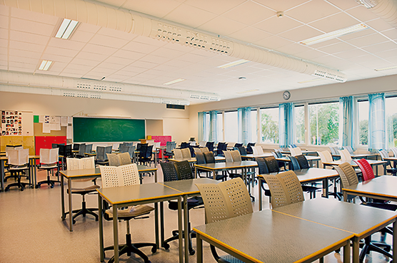 Undervisningsrom med lydabsorbent i hele himlingen og fast tavleposisjon