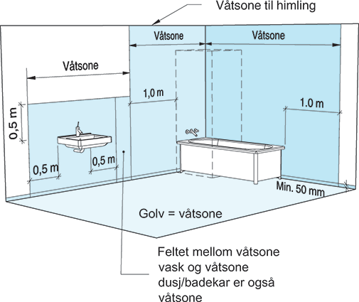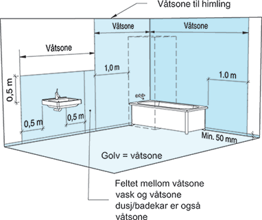 Soneinndeling på et bad hvor det er angitt anbefalt minsteareal for de våte sonene