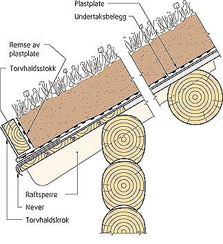 Eksempel på oppbygning av torvtak over uoppvarmet bygning. Taket har tettesjikt av undertaksbelegg og plastplate.