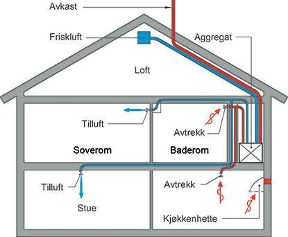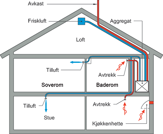 Hus med balansert ventilasjon med varmegjenvinning. Ventilasjonsaggregatet er plassert lett tilgjengelig for vedlikehold. Horisontale kanalføringer i etasjeskilleren. Pilene indikerer luftføringen gjennom kanaler og ventiler. Avtrekk fra kjøkkenhetta går utenom ventilasjonsanlegget.