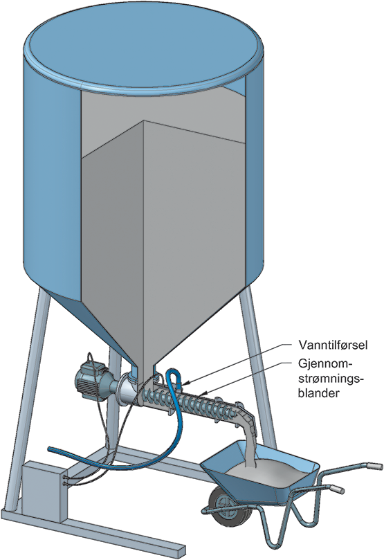 Tørrmørtel levert i silo med påmontert gjennomstrømmingsblander og vanntilførsel