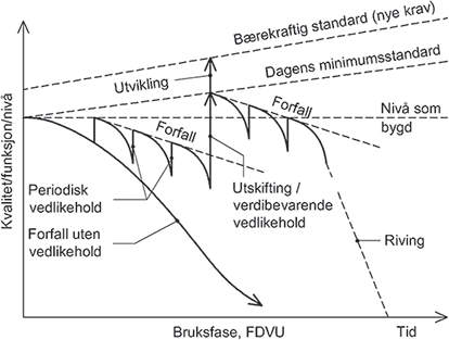 Forenklet skisse som viser utvikling av kvalitet eller standard avhengig av om bygningen vedlikeholdes