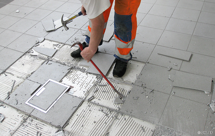Når områder med løse fliser og bom er kartlagt, fjernes de løse flisene for å kontrollere tilstanden under. Flisene kan fjernes med f.eks. brekkjern ved å sette brekkjernet under kanten av flisa og brekke opp. Hvis man ikke har ekstra fliser, må man prøve å bruke flisene om igjen. Foto: SINTEF