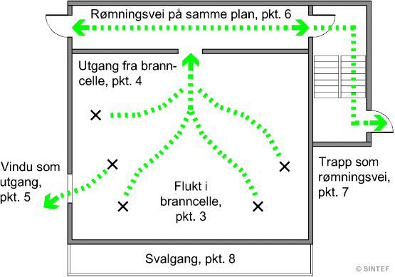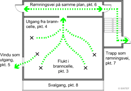 Denne anvisningen viser hvordan man kan tilrettelegge bygninger for rømning ved brann og branntilløp. Anvisningen omtaler flukt i branncella, hvilke rømningsveier som er aktuelle og hvordan de kan utformes i ulike risikoklasser, samt akseptable utganger til sikkert sted. Løsningene ivaretar preaksepterte ytelser i veiledningen til byggteknisk forskrift.
