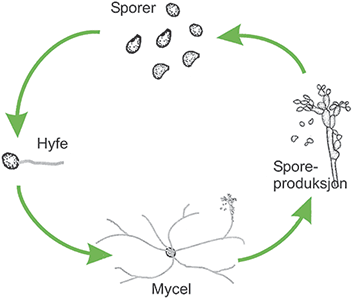 Sporer er soppens formeringsenheter, hyfer er mikroskopisk tynne tråder og mycel et sammenhengende nett av hyfer.