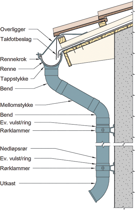 Takrennesystem for avrenning og nedløp fra skrå tak. Systemet består av takrenne med oppheng og tappstykke, og nedløpsrør med rørklammer, bend og utkast.