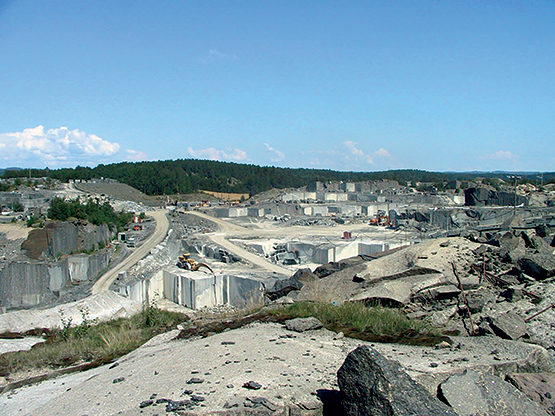 Larvikittbrudd på Klåstad i Vestfold. Diamantwiresagingen som brukes til uttak av blokker, gir karakteristiske, rette bruddvegger. Foto: SINTEF Byggforsk