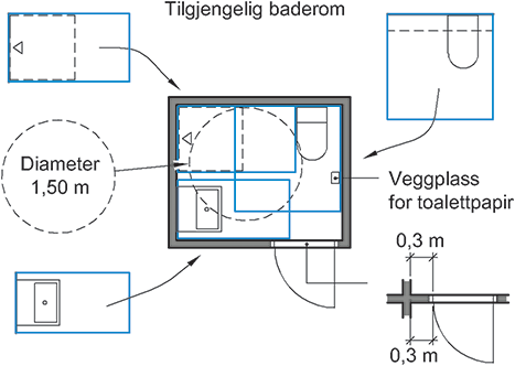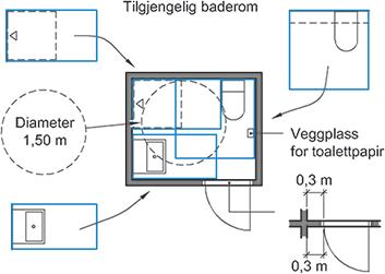 For baderom og toalettrom i bygninger hvor TEK17 krever universell utforming, se Planlegging 379.201.