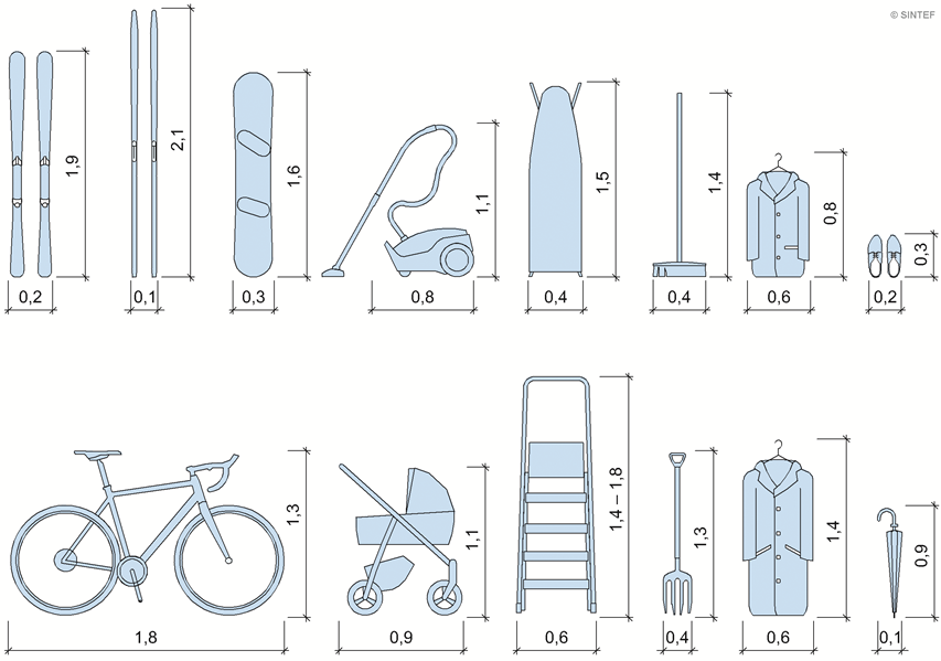 Kjøkkenskap og -innredning er behandlet i Planlegging 361.411 Kjøkken i bolig. Plassbehov for bil- og sykkelparkering er omtalt i Planlegging 312.130 Parkeringsplasser og garasjeanlegg.