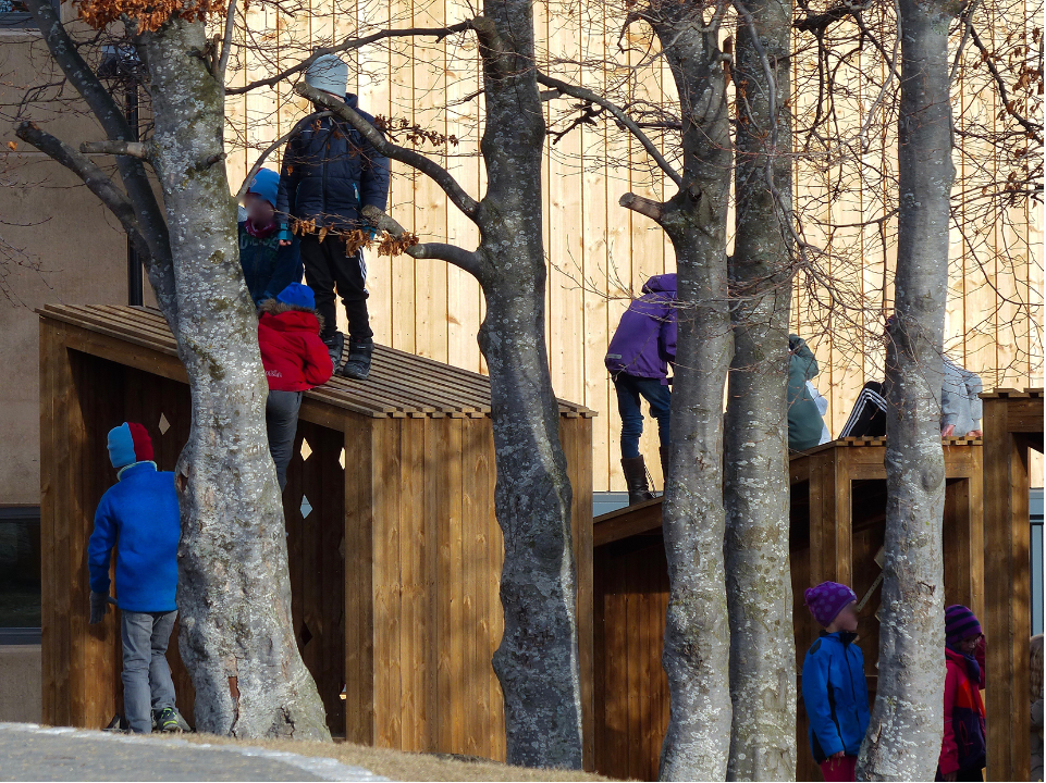 Variert utforming og naturinnslag er viktig for å skape gode uteområder. Det forutsetter en gjennomtenkt disponering av tomta og at arealet per barn er tilstrekkelig. Åsveien skole. Landskapsarkitekt: Løvetanna landskap. Arkitekt og foto: Eggen Arkitekter AS