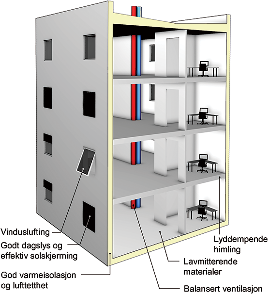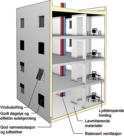 Mer om oppfølging, kartlegging og tiltak for inneklima når bygningen er i drift, fins i Byggforvaltning 700.105 Inneklimaproblemer i yrkesbygninger. Om inneklima i boliger, se Byggdetaljer 421.510 Godt inneklima i nye boliger.