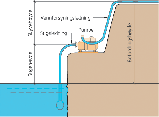 Skyvehøyde (trykkhøyde): høydeforskjell pluss trykktap, regnet i mVs, som følge av strømningstap gjennom rør og komponenter ved dimensjonerende vannføring, fra pumpa og fram til det ugunstigste tappestedet eller til samletank