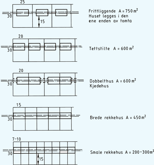 I områder med lav varmetetthet vil grøftelengden pr. kW installert varmeeffekt være relativt stor. I et område med både rekkehus og frittliggende eneboliger er grøftelengden mellom 10 og 30 m pr. bolig, se fig. 0.