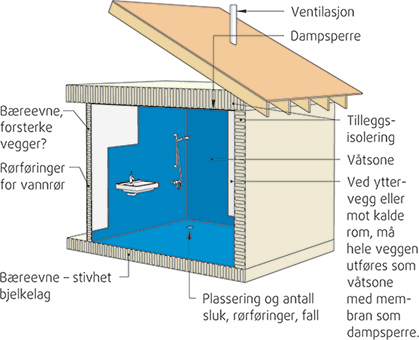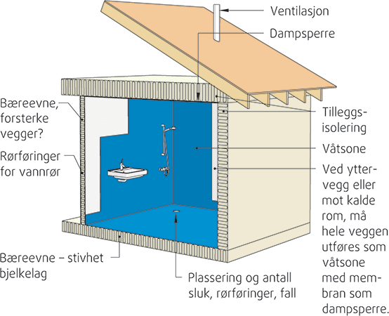 Dette bladet beskriver modernisering og utvidelser av baderom og bygging av nye bad i eksisterende trekonstruksjoner, se vignett.