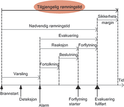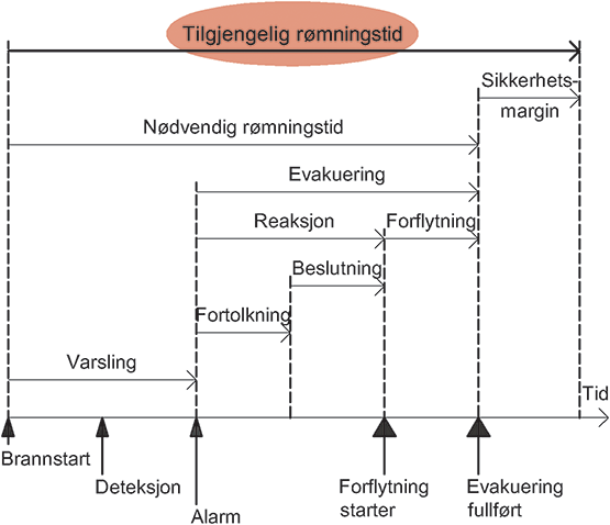 Tilgjengelig rømningstid inngår vanligvis i en analyse av rømningssikkerhet sammen med nødvendig rømningstid, se Byggdetaljer 520.385 Nødvendig rømningstid ved brann.