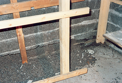 Eksempel på sulfatskade i grunnmur. Sulfatskader opptrer som oppsmuldring av selve lettklinkerblokkene. Foto: SINTEF Byggforsk
