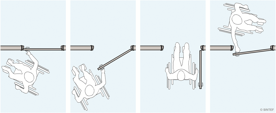 Bevegelsesmønster for rullestolbruker som åpner, passerer og lukker en slagdør