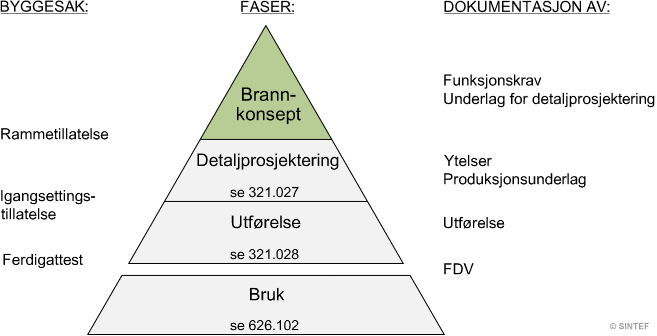 Figuren gir en oversikt over faser i byggeprosjektet som krever dokumentasjon av brannsikkerhet, og henviser til anvisninger der fasene omtales nærmere. Se også Planlegging 321.025.