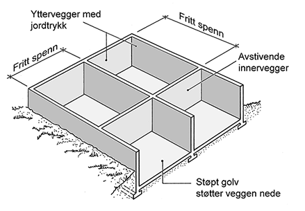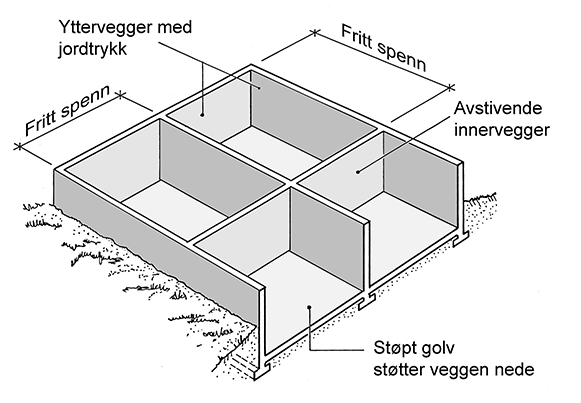 Dette bladet omhandler dimensjonering og utførelse av plasstøpt betongvegg mot terreng i rom i kjellere eller underetasjer i småhus. Bladet gjelder for vegger med høyde opptil 2,5 m. Høyden på tilbakefyllingen kan være opptil 2,2 m, målt i forhold til nivået på kjellergolvet.