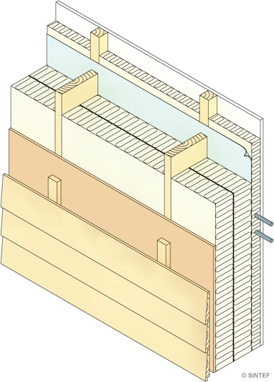 Eksempel på oppbygning av yttervegg av bindingsverk med inntrukket dampsperre og liggende utvendig trekledning