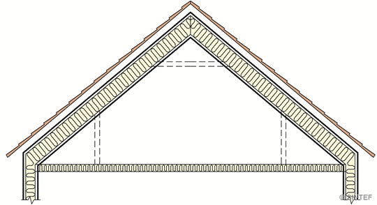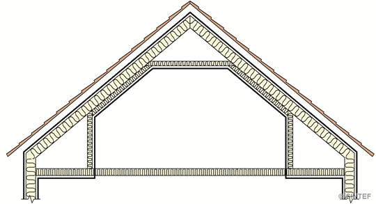 Skrå tretak med isolasjon i takflaten, knevegger og i hanebjelkelag