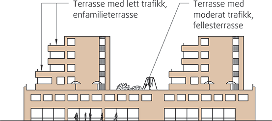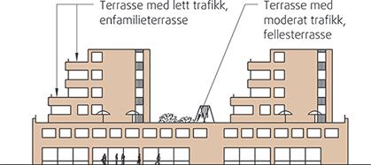 Med terrasser for moderat trafikk menes fellesterrasser med mye gangtrafikk og med mulighet for noe begrenset motorisert ferdsel for tilsyns- og vedlikeholdsoppgaver.