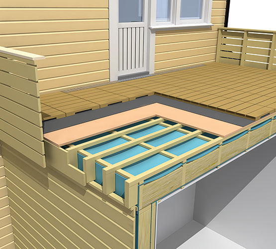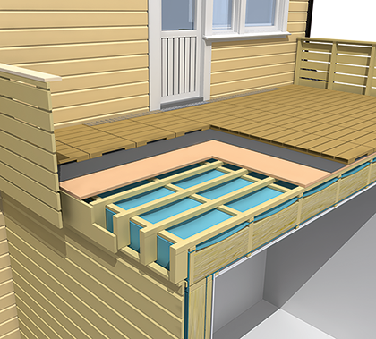 Denne anvisningen beskriver isolert, luftet terrasse med trebjelker over oppvarmet rom, se vignett. Løsningen er begrenset til terrasser over oppvarmet rom i boliger med kun én boenhet.