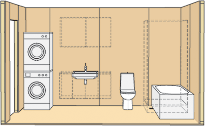 Alle vegger i dette eksemplet er kledd med 18 mm tykk kryssfiner under ett lag gipsplate eller våtromsplate med polystyrenkjerne. Det meste av utstyret kan da monteres uten ekstra spikerslag, se tabell 2 b og pkt. 5.