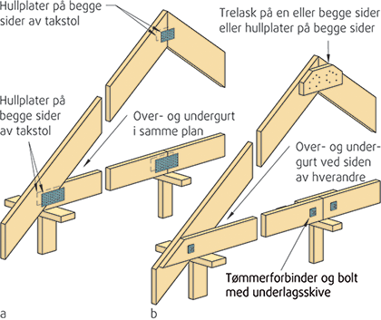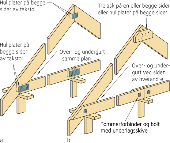 Oppbygging av takstoler. En eventuell skjøt plasseres på midten av spennet over en understøtting.