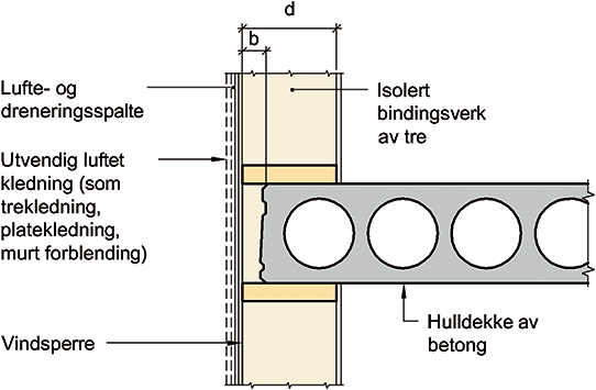 Prinsipiell oppbygning av tilslutning mellom vegger med isolert bindingsverk av tre med gjennomgående stendere, og hulldekke av betong