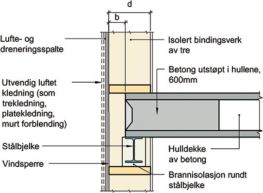 Prinsipiell oppbygning av tilslutning mellom vegger med isolert bindingsverk av tre med gjennomgående stendere, og hulldekke av betong opplagt på stålbjelke