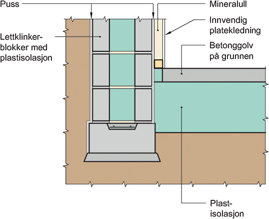 Prinsipiell oppbygning av tilslutning mellom vegg mot terreng, murt av lettklinkerblokker med plastisolasjonskjerne og betonggolv på grunnen