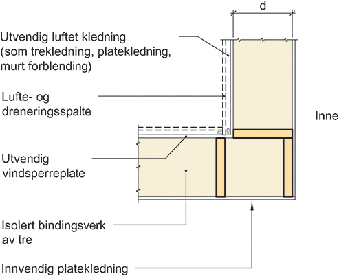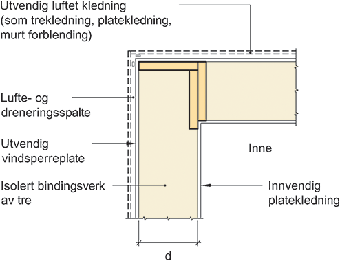 Prinsipiell oppbygning av utovervendt hjørne mellom bindingsverksvegger av tre