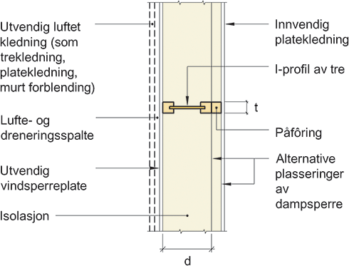 Prinsipiell oppbygning av vegg med bindingsverk av I-profiler av tre