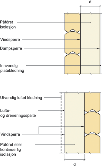 Prinsipiell oppbygning av laftet trevegg med innvendig påfôret isolasjon eller utvendig kontinuerlig isolasjon