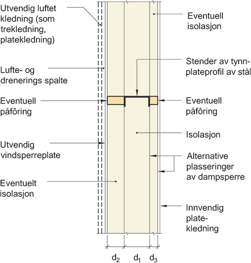Prinsipiell oppbygning av vegg med isolert bindingsverk av tynnplateprofiler av stål, eventuelt med påfôret isolasjon på innsiden/utsiden